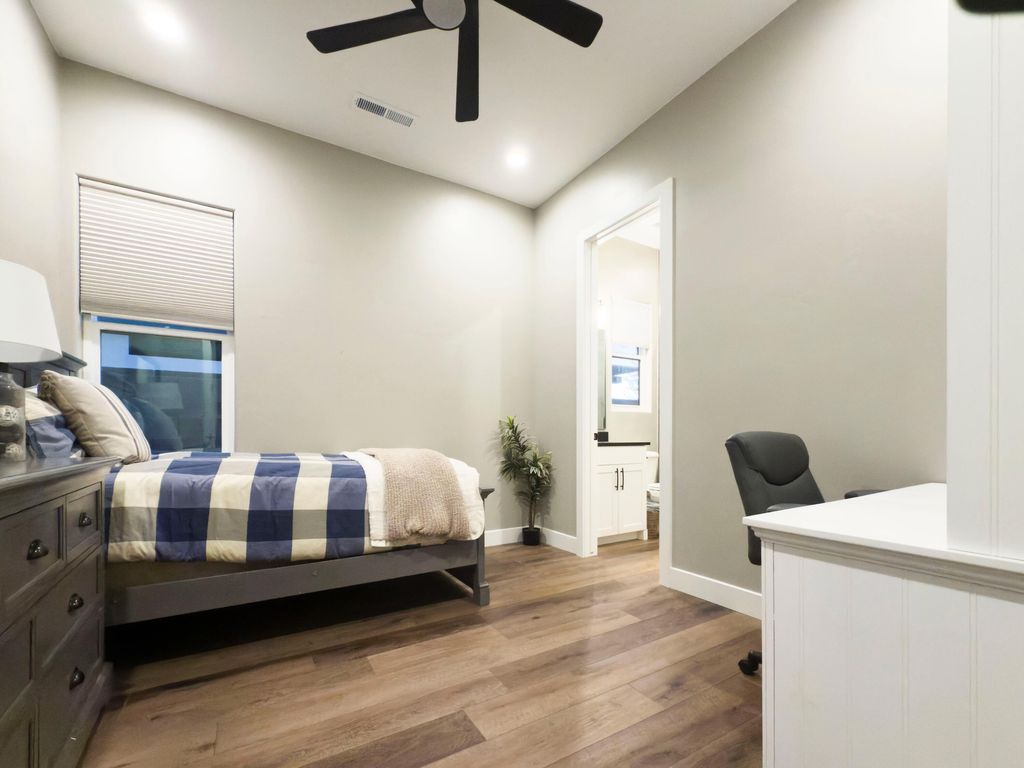 This luxury home showcases panoramic views of the valley and Pine Valley Mountain. With 5 spacious bedroom sand 4.5 baths, the ope concept layout is filled with natural light and designed for both comfort and sophistication. Exceptional craftsmanship throughout! The living room features a stunning fireplace and large sliding doors that seamlessly blend indoor and outdoor living. The gourmet kitchen is equipped with top of the line appliances, large island quartz countertops and custom cabinetry. The generous primary suite includes a spa inspired ensuite bath. Outside, the pristine backyard offers multiple awnings, low maintenance turf and a 9 person hot tub overlooking the valley. Additional highlights include a 4 car garage and direct access to the nearby bike trails.
