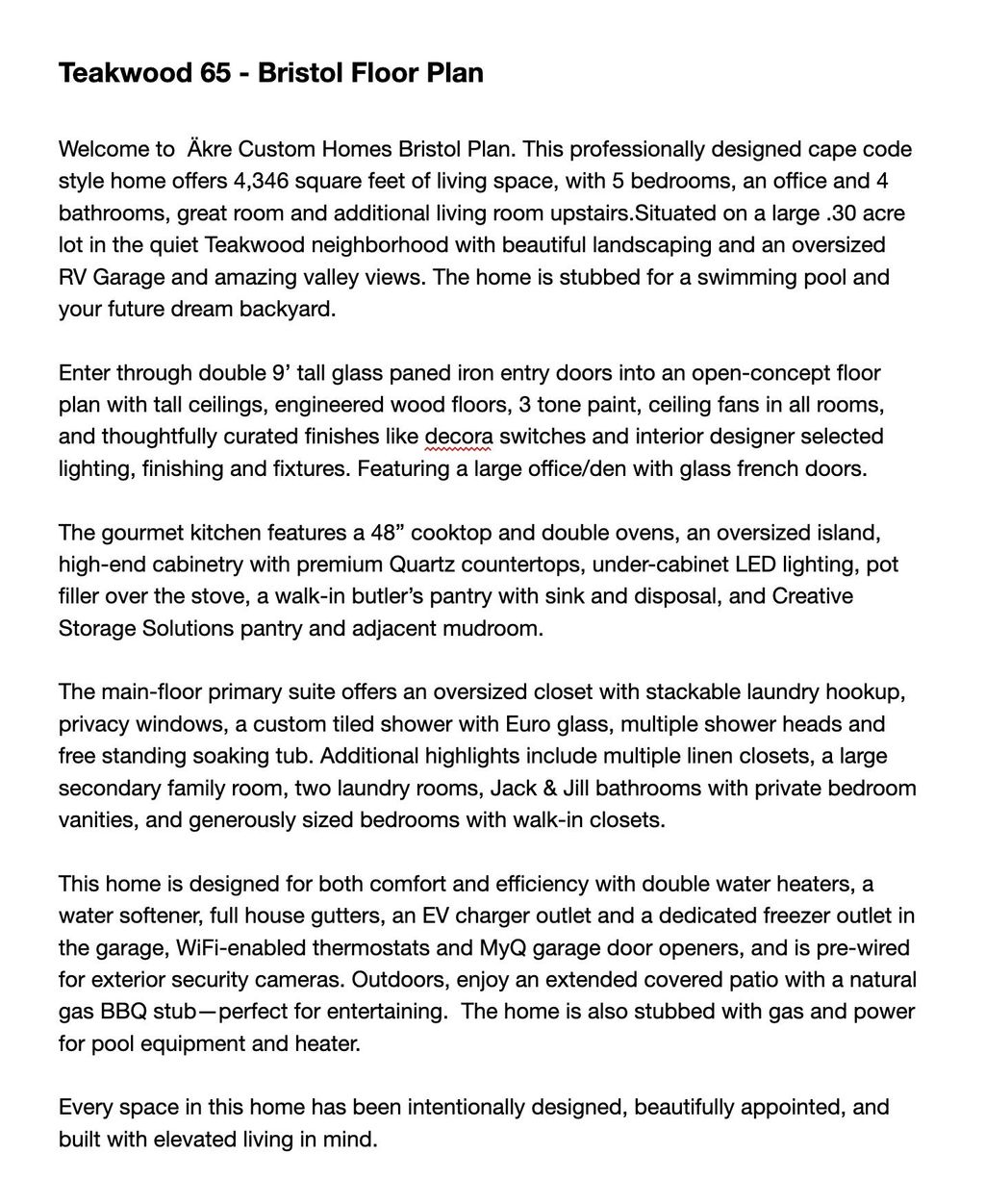Meet Akre Custom Home's newest cape cod style Bristol plan. A statement of luxury, comfort, and thoughtful design. With spacious living areas, high-end finishes, and a seamless flow between rooms, this (5) five-bedroom, (4) four-bathroom home embodies the craftsmanship and sophistication that define Akre's quality. Two laundry rooms, a great room for entertaining and a second living space upstairs with J&J bathrooms, private vanities and tall ceilings. Clean lines, premium materials, and a balance of modern elegance and inviting warmth make it a place where family life and effortless entertaining come together beautifully. A true custom masterpiece with large living spaces and elevated views of little valley. XL garages, RV, Stubbed for a pool, EV Charge outlet, smart home wired & more.