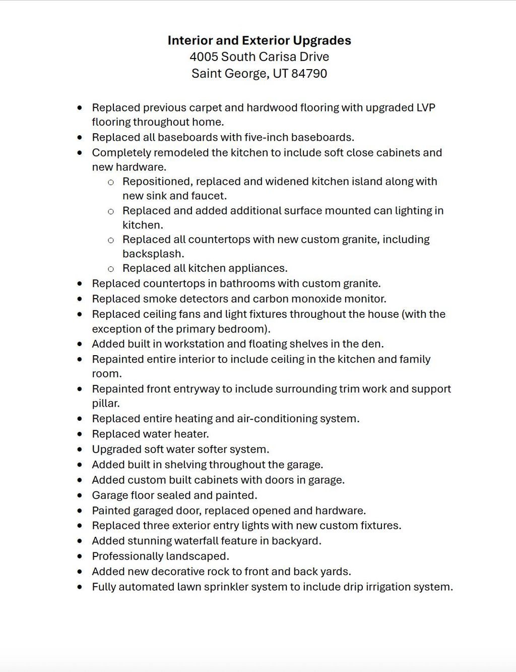 Welcome to this beautiful updated well maintained 3 bedroom 2 bathroom 2 car garage home. Located in sunny St. George! Nearby are schools, parks, walking trails, shopping, freeway access to restaurants and airport minutes away with more to come. This home includes over 60K in recent updates! New stainless steel appliances, new white kitchen cabinets, granite countertops, new 5'' baseboards, new LVP flooring throughout and a lot more. The back yard is beautiful and has a nice water feature as well. Replaced water heater, replaced entire heating and air-conditioning system. White entertainment center in living room is included. Also several interior and exterior upgrades (list of these items in the photo attached. Dining room light fixture in pictures not included with home.