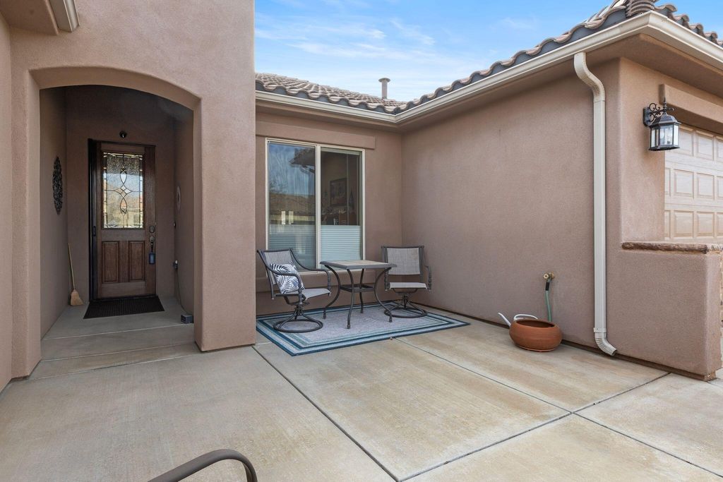 Welcome to SunRiver luxury living! This bright and airy home features a spacious front courtyard, an open-concept living area, built-ins, and a dedicated office. The kitchen features granite countertops and stainless steel appliances. Washer and dryer are included. The primary suite includes a walk-in shower and a generous walk-in closet. There is a large climate-controlled 4-car garage with a separate storage room and its own mini-split. Enjoy modern comforts, including top-down/bottom-up blinds and remote-controlled electric shades. The backyard opens to a common area, creating a sense of openness, privacy, and spaciousness. Perfect for relaxed desert living.