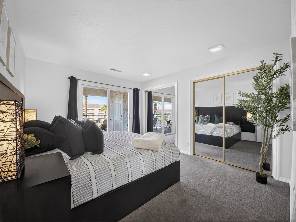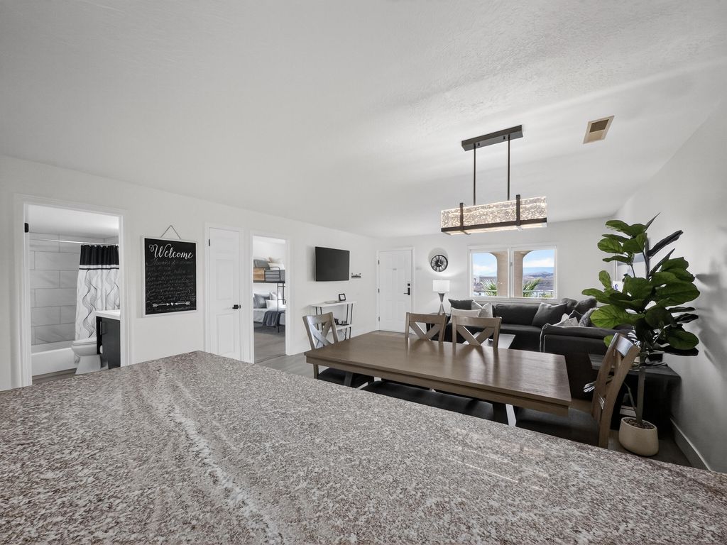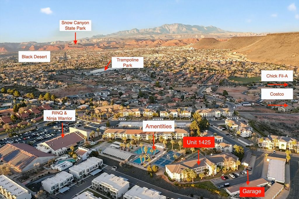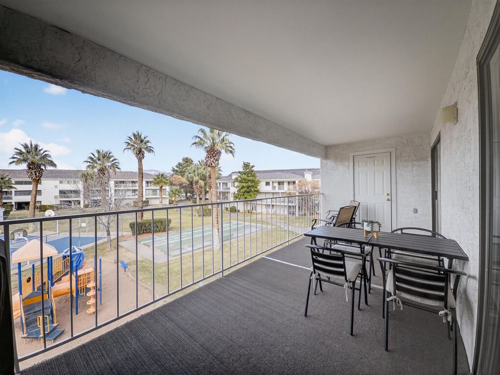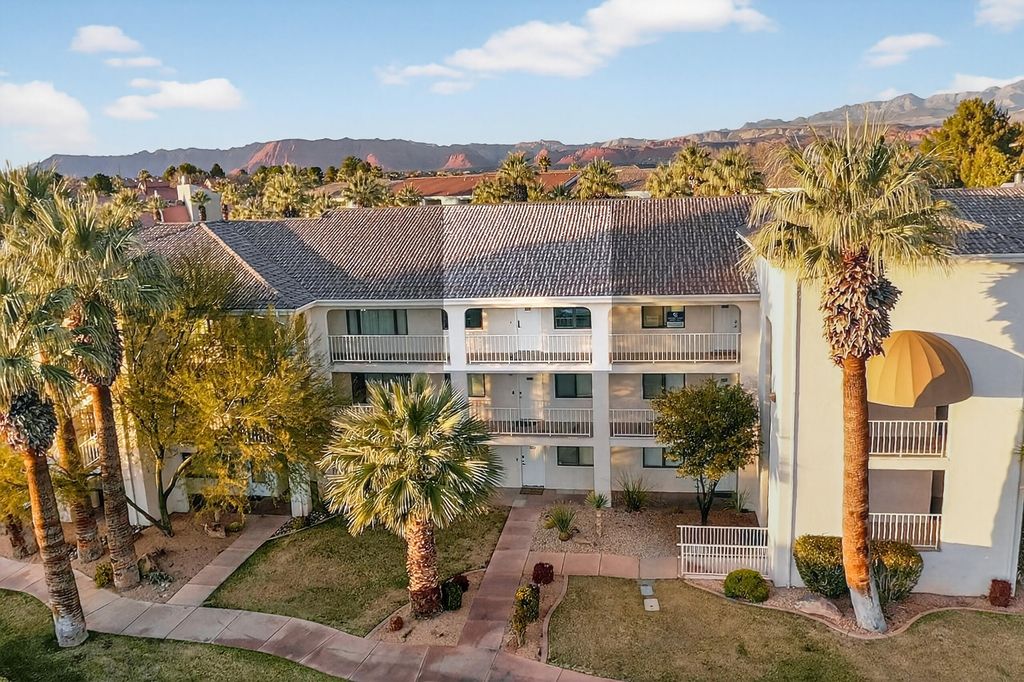 Welcome to Las Palmas Resort where this top-floor condo stands apart as a fully remodeled, truly turnkey retreat designed for effortless living and high-performing nightly rentals. This unit has been completely refreshed from top to bottom, featuring brand-new bathrooms, new appliances, and stylish modern furnishings all included in the price. Every detail has been thoughtfully curated, making this home ready from day one. The open-concept floor plan is filled with natural light and anchored by durable, modern LVP flooring, creating a clean, contemporary feel throughout. Also included is a washer/dryer in the unit and a detached garage. Whether you're relaxing inside or stepping out onto the top floor covered patio to take in the incredible red rock and resort views, this home delivers a seamless blend of comfort and style. Beyond the condo, enjoy one of Southern Utah's most amenity-rich communities: five resort-style pools (indoor & outdoor), pickleball courts, clubhouse, and playgroundsperfect for owners, guests, and investors alike. Approved for nightly rentals or second-home use, this property offers exceptional flexibility and income potential. Location seals the deal. Minutes from Snow Canyon State Park, Black Desert Resort, golf, hiking, biking, shopping, and dining with quick access to the highway for easy exploring. Entertainment is right around the corner at The Grip, The Rinq and Nets on Fire making this an unbeatable home base for adventure and fun. Fully remodeled. Fully furnished. Exceptionally clean. Incredible views. This is not just another condo at Las Palmas, this is the one that's ready to perform, impress, and make memories immediately.