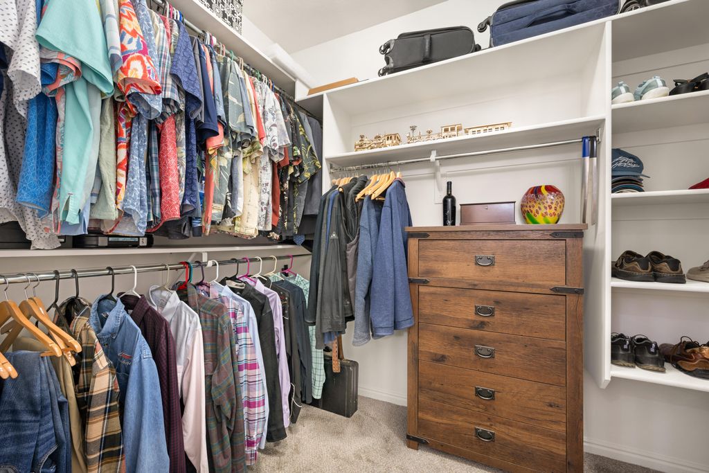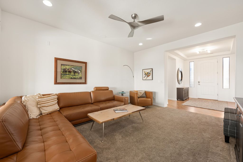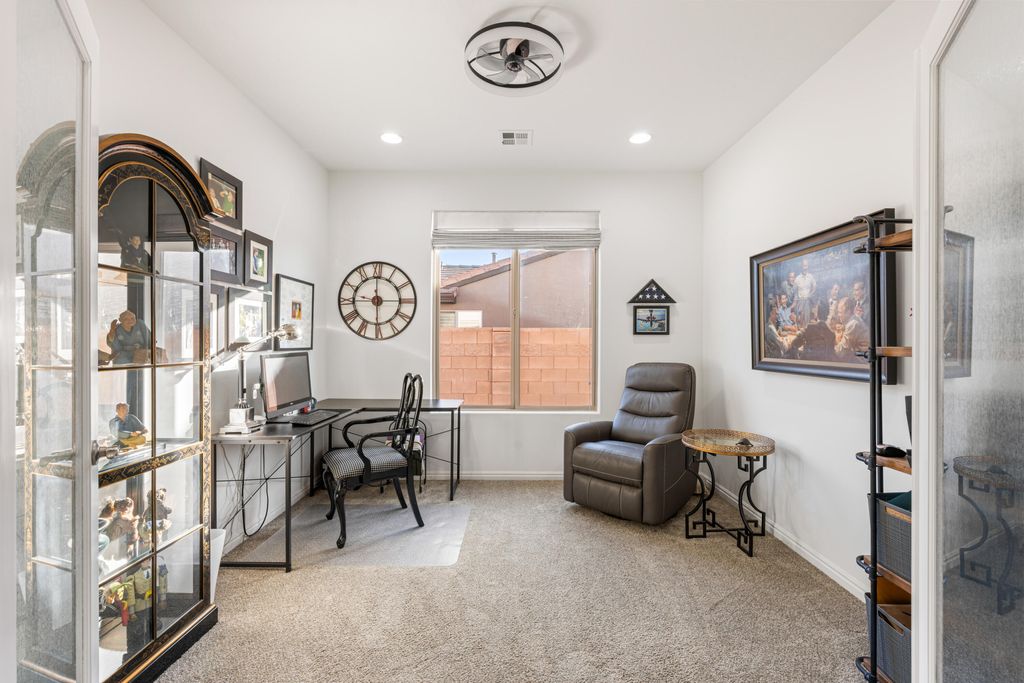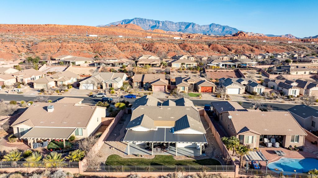 Located in the highly desirable Coral Canyon community with low HOA fees and fantastic amenities, this beautifully maintained home sits on an oversized .24-acre lot that extends 15 feet beyond the back fence and backs to open space -- giving you extra privacy and room to breathe. Enjoy true outdoor living under the 750 sq ft covered patio with mountain views and immaculate landscaping -- your own private retreat. Inside, the open-concept layout shines with natural Knotty Alder cabinetry, Corian countertops, and a cozy family room featuring a gas fireplace, new wood mantel, and custom built-in bookcases. A formal living room adds flexible entertaining space. Smart split floor plan with 4 spacious bedrooms + den/office with French doors. The 2.5-car garage includes custom cabinets, overhead storage, and an epoxy floor. Major bonuses: whole-home water filtration, recirculating hot water system, plus updated lighting and fans throughout. Space, upgrades, privacy, and views all in one of the area's most sought-after neighborhoods