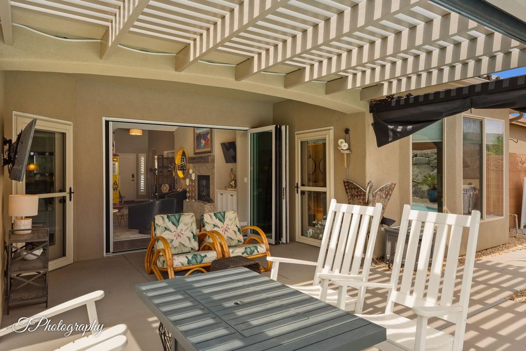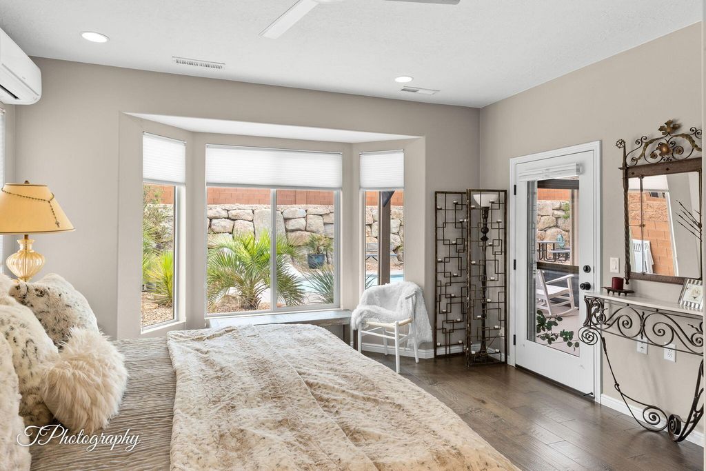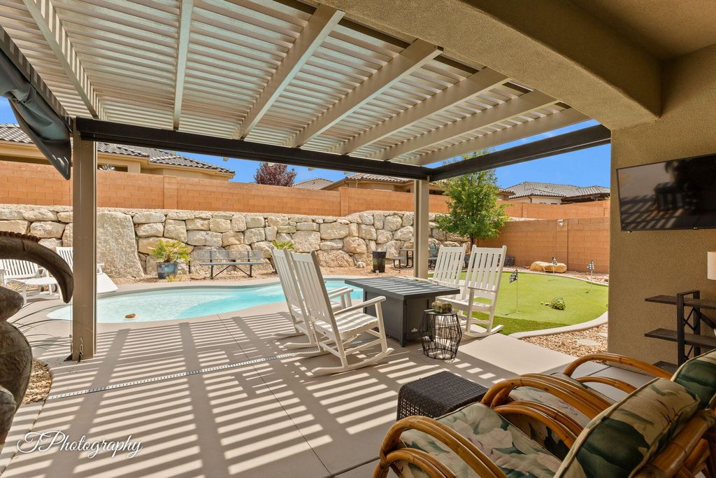 55+ living in SunRiver with a PRIVATE POOL and spa in one of the most desirable active adult communities in St George. This thoughtfully upgraded home offers 2 bedrooms plus a den and an additional small office or hidden room, providing flexibility or a dedicated workspace. The renovated primary bath features a luxury walk in shower and a Japanese soaking tub, creating a true spa experience at home. Mini split systems in the primary suite and garage provide customized climate control year round. Wood floors, quartz countertops, designer and artistic finishes, and a bright open layout deliver both comfort and refined style. A full glass wall opens to an expanded patio, creating seamless indoor outdoor living that takes full advantage of Southern Utah's climate. The 3 car garage offers generous space for vehicles, storage, or golf cart parking. The backyard is designed for both relaxation and entertaining with a private pool, spa, putting green, and low maintenance landscaping that delivers a resort style setting without the upkeep. Situated on a quiet street away from freeway and close to river walking trails, golf, clubhouse amenities, pickleball, indoor and outdoor pools, fitness center, dining, and year round social activities. Exceptionally maintained, this is a standout pool home in SunRiver for buyers seeking high-end 55+ living in St George.