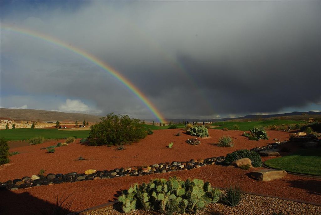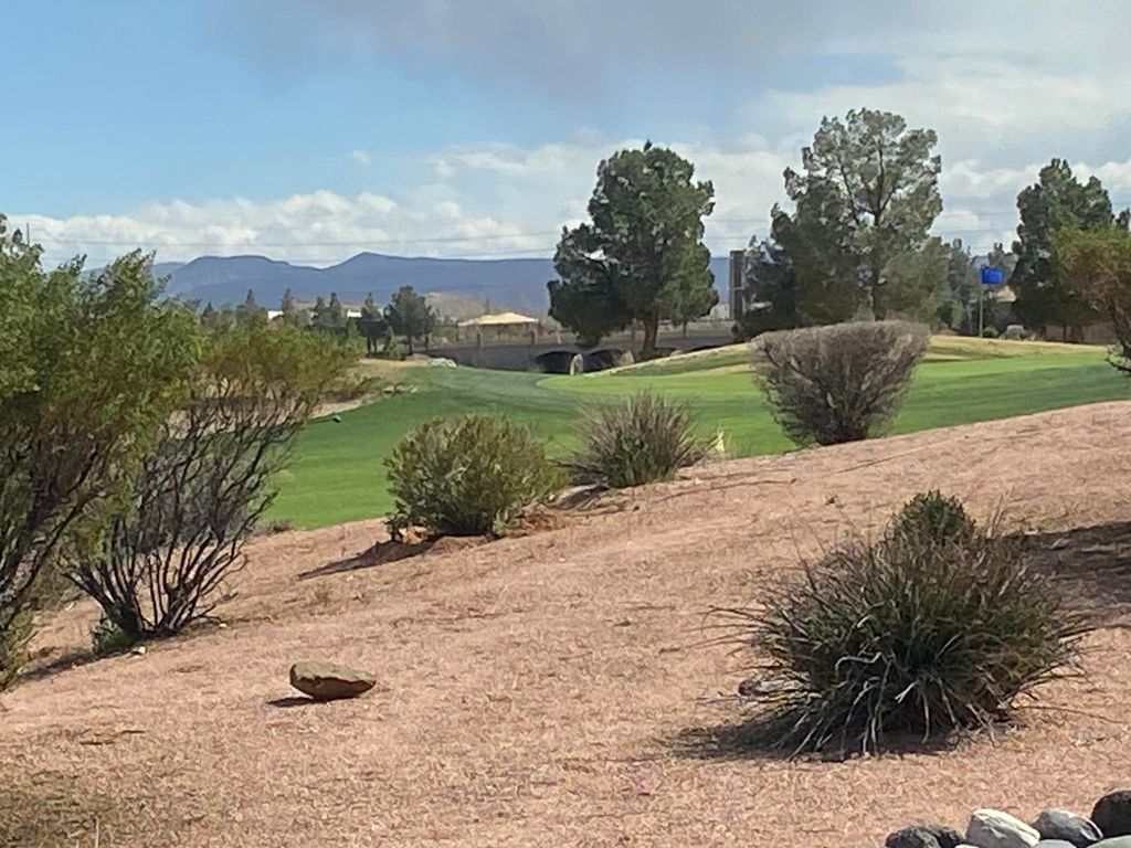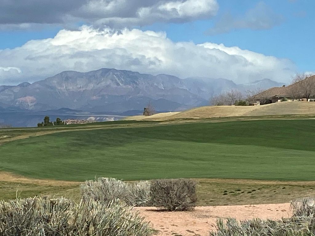 Views! Views! Views! This home has it all--Pine Valley Mountain, majestic desert skies, and the 12th fairway and green of the Sun River Golf Course. The natural beauty continues inside the home with 18 x 18 porcelain floor tiles, Vermont maple hardwood floors in the bedrooms, and maple cabinetry throughout the home. Energy features abound and include 2 x 6 exterior walls with R24 insulation, attic R50 blown in insulation, a whole house attic fan, ceiling fans, and a Mitsubishi ''Mr. Slim'' 22,000 btu air conditioner in the 3-car garage. Larson storm doors and low E 140 windows keep the outside temperatures out. Dixie Power keeps the electricity bills down. Bay windows enlarge the bedrooms. With the flexibility of a Murphy bed, the guest bedroom can be used for sewing, or crafts. Four ladder-back hanging bar stools with brushed nickel footrests. Handicapped accessible bathroom.